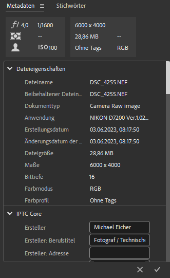 Auf der rechten Seite unterhalb des Histogramms gibt es eine Anzeige der bei der Aufnahme verwendeten Belichtungsdaten, sowie eine umfangreiche Möglichkeit zur Bearbeitung der Metadaten.